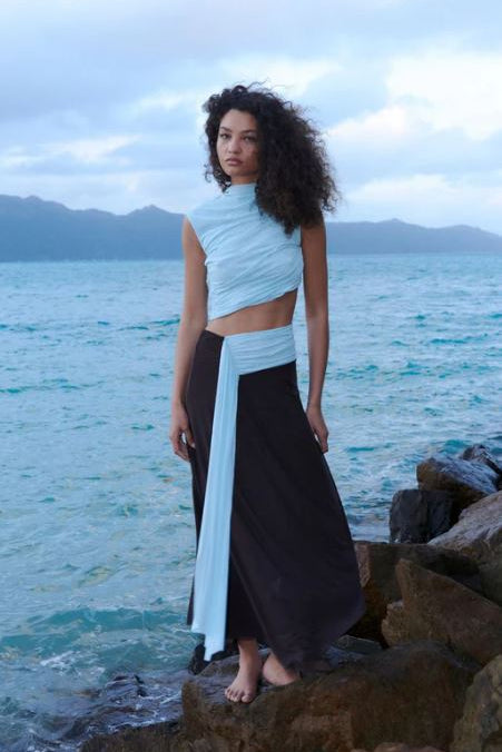 Bec and Bridge Conni Asym Midi Dress in Arctic Blue and Dark Chocolate