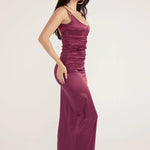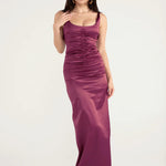 A sleek full length maxi dress with a scoop neckline and ruched bodice that contours the waist. The straight silhouette falls cleanly to the floor, finished with a small back slit for ease of movement. Crafted in a smooth glossy stretch duchess satin.
