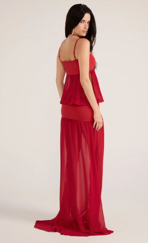 A dreamy blend of structure and softness, with a square neckline, delicate straps, and a fitted waistband flowing into a draped, asymmetric chiffon skirt. The lightweight fabric creates an elegant, fluted silhouette.