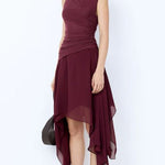 An elevated plum midi dress featuring an asymmetric mesh bodice and a contrasting georgette skirt designed with sculpted gathers.