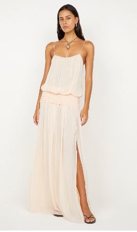 Flows into a gathered maxi dress