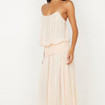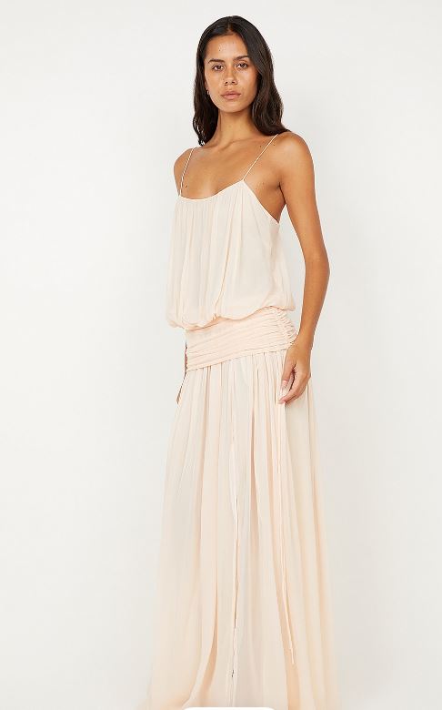 Camille Blouson Dress in Peach. This stunning maxi dress is perfect for spring dressing, whether you're looking for an elegant vacation dress, a flowing maxi for casual wear, or a beautiful wedding guest dress.