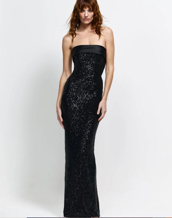 Featuring a timeless strapless silhouette, Thalia is crafted from our luxurious sequin fabrication. Elevated by a sleek satin band, Thalia flows into an elegant floor length hemline with subtle back split.