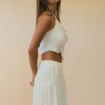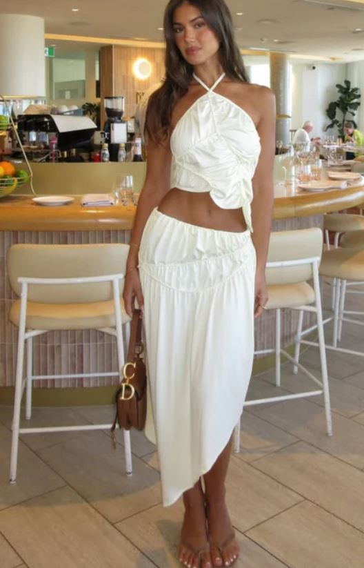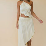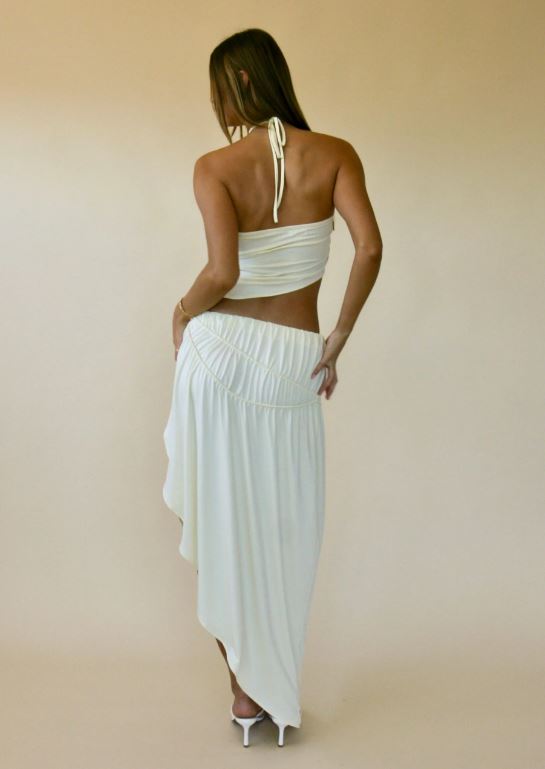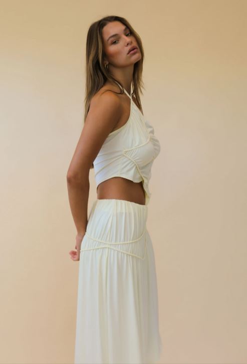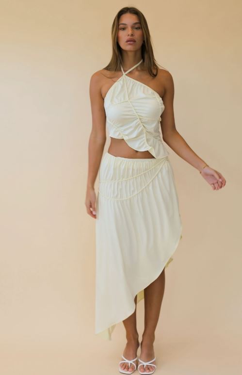 Sculpted and sensual, meet the Fleur Top by Koster Kulture designed to flatter with bold abstract hand-tacked piping details. Crafted in a soft butter yellow from a recycled poly-elastane blend, it offers a gentle stretch that flatters the body with movement. An off-centre halter neckline ties delicately at the neck with adjustable thin straps. Finished with an asymmetrical hem that blends vintage glamour into a modern twist.