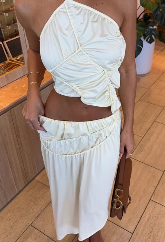 Featuring an asymmetrical hem and elegant side slit, this piece moves effortlessly with you. Hand-tacked piping details delicately scoop across the waist, artfully sculpting the feminine figure. Crafted from a soft buttery yellow eco recycled poly-elastane blend, the Fleur Skirt blends vintage artistry with dainty appeal. An expressive essential that pairs seamlessly with the matching Fleur Top