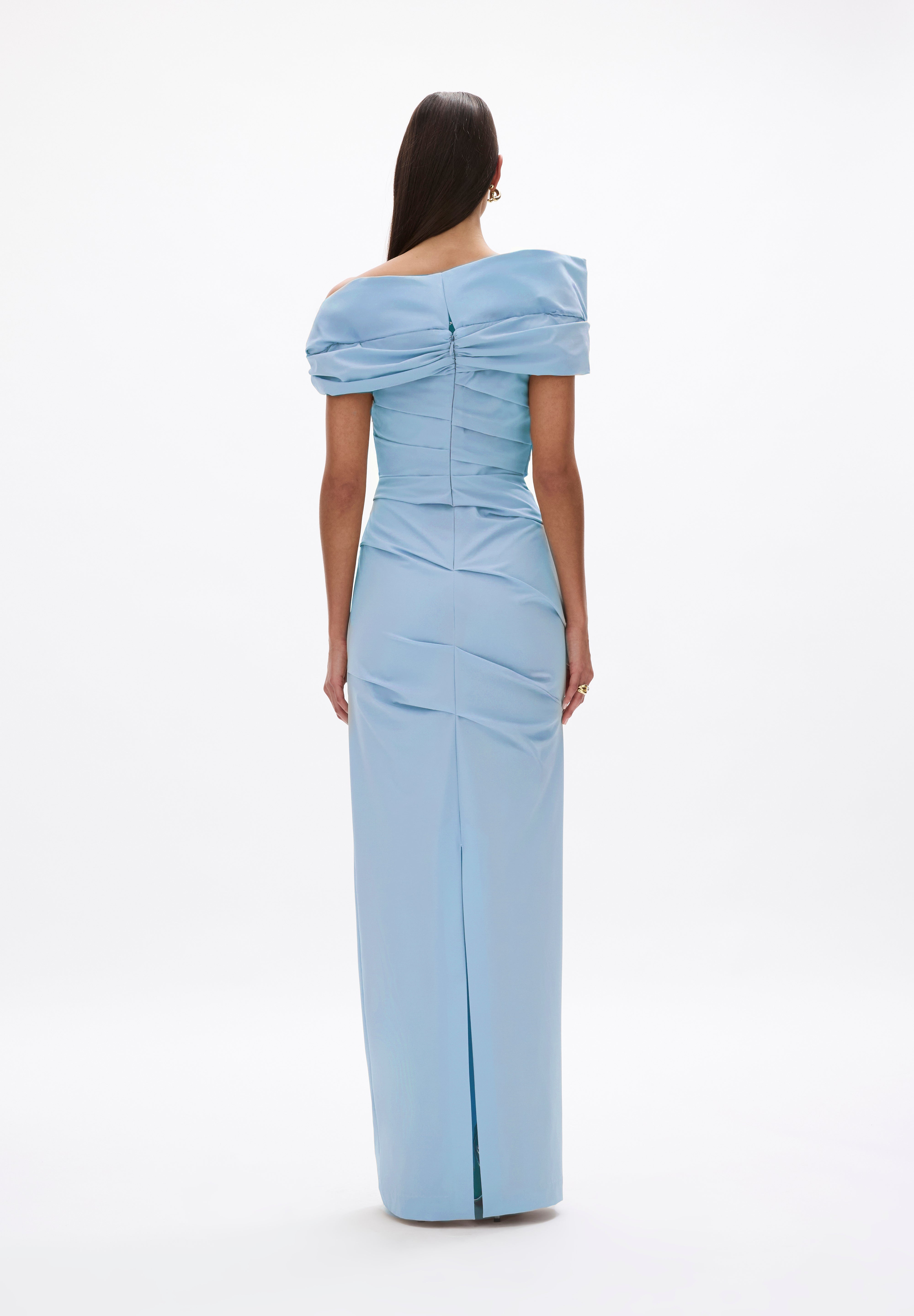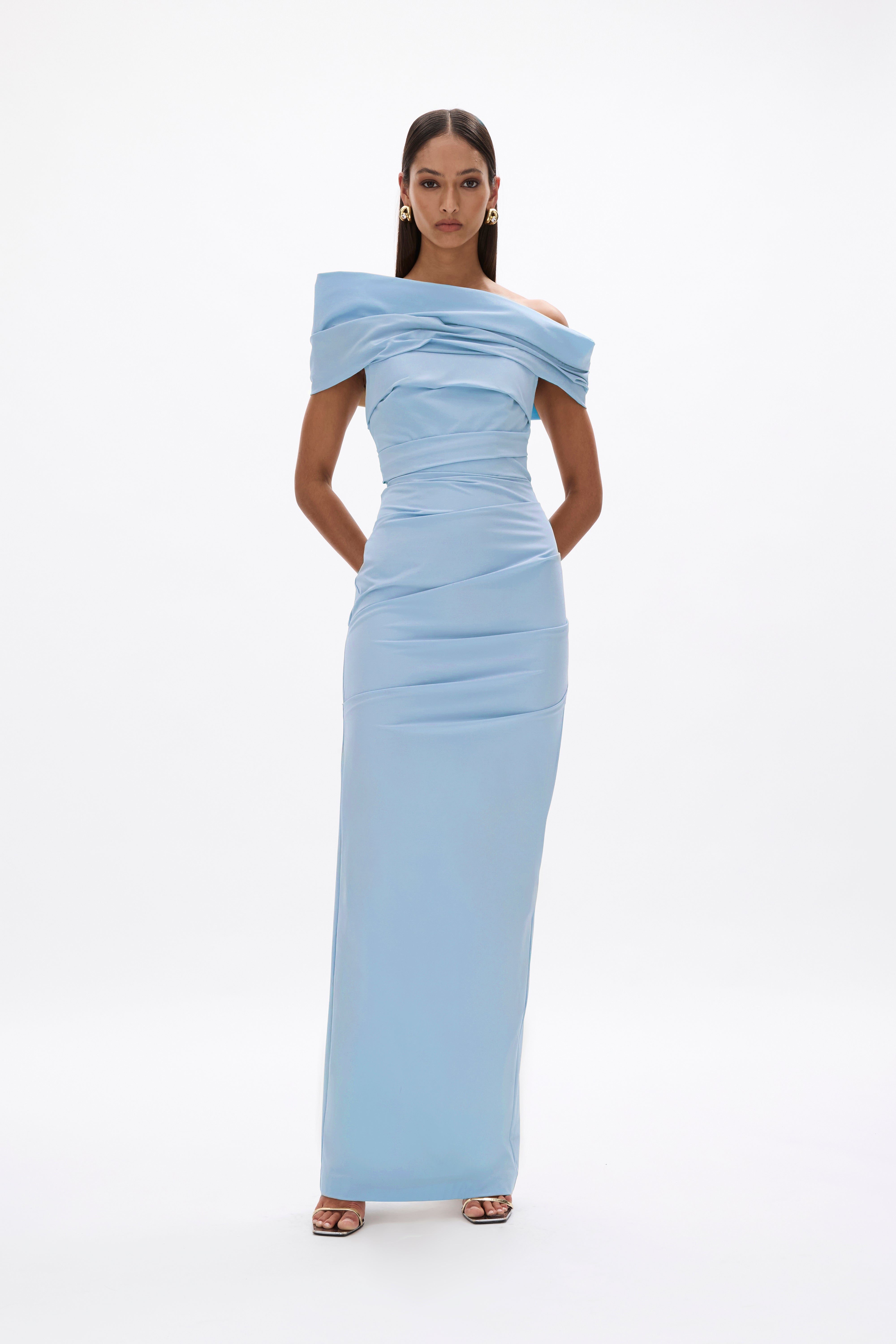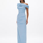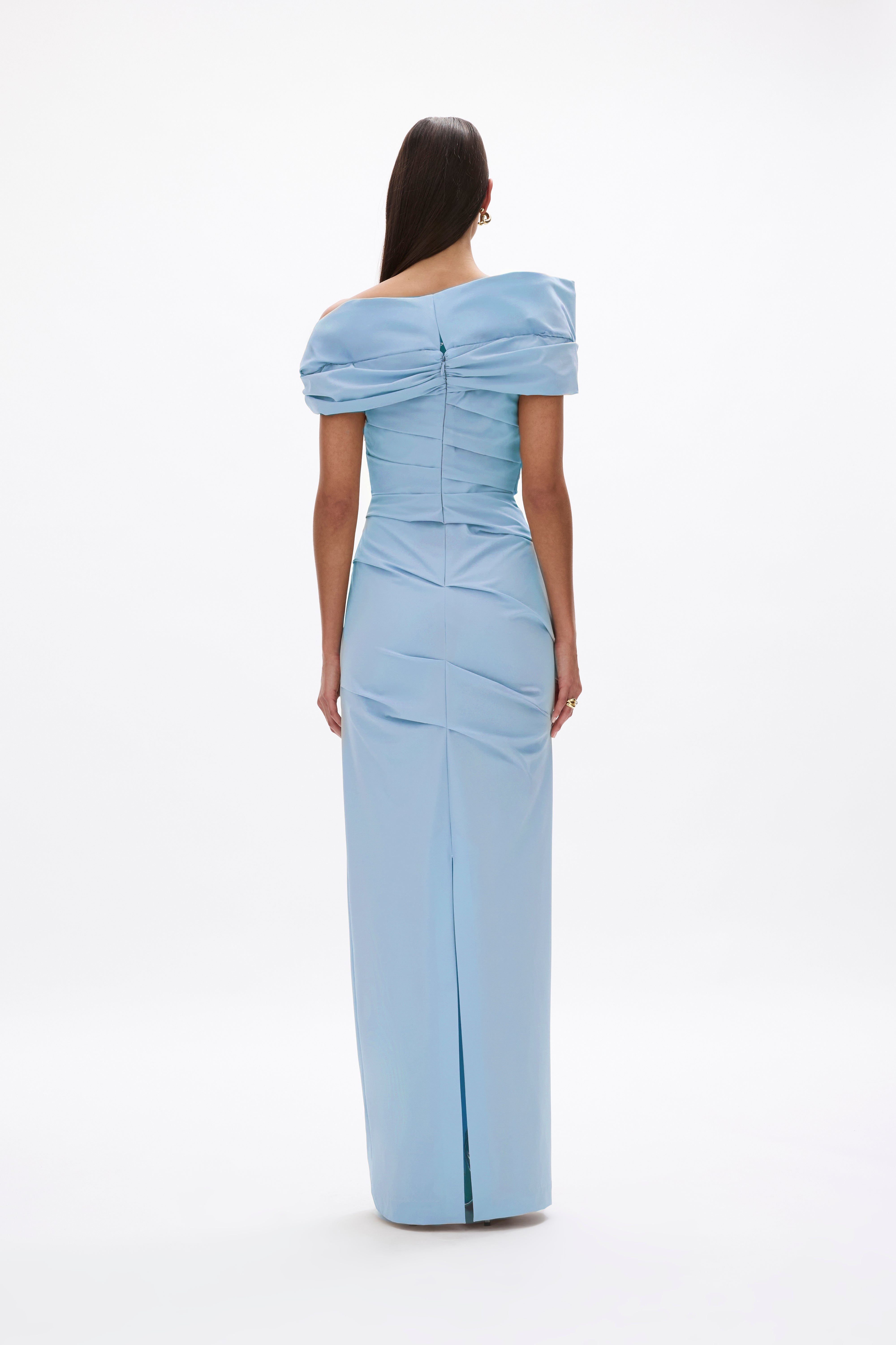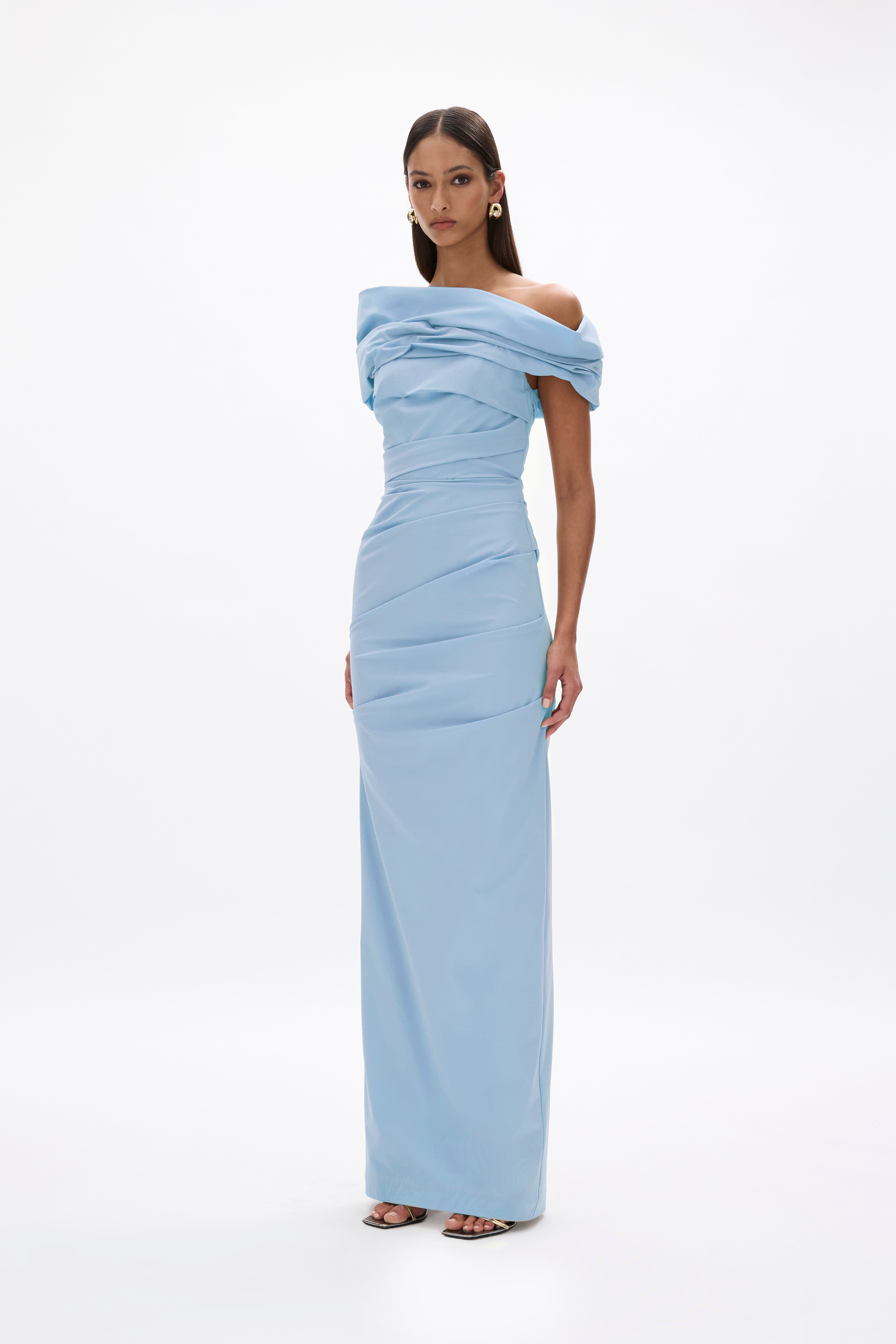The Monique Gown in Sky Blue is a full length draped column silhouette designed for evening occasions and formal events. It features an asymmetrical neckline with crinoline through the sleeves, finished with soft tucks along the bust and waist for a flattering, sculpted fit.