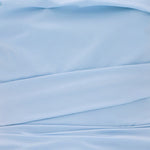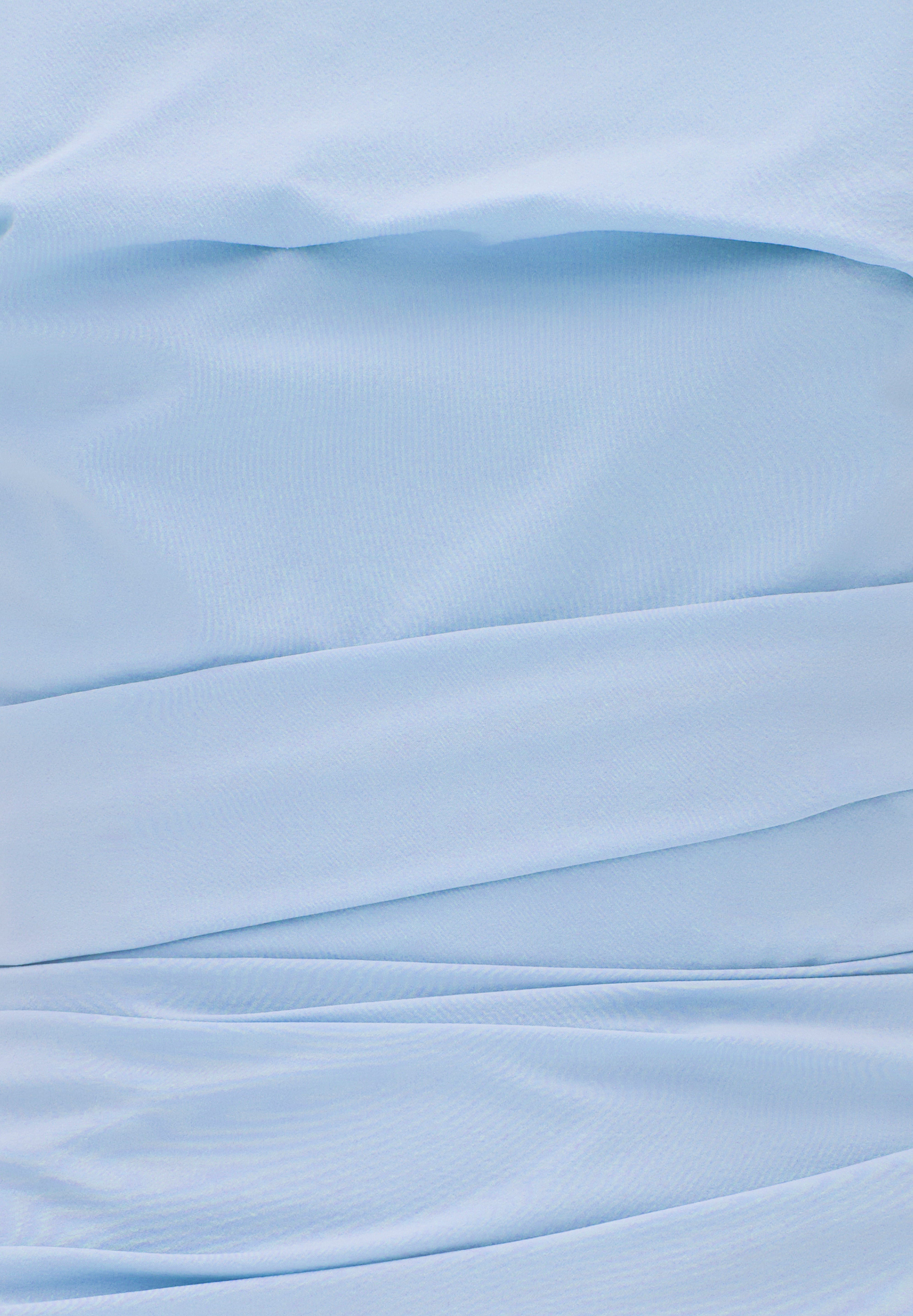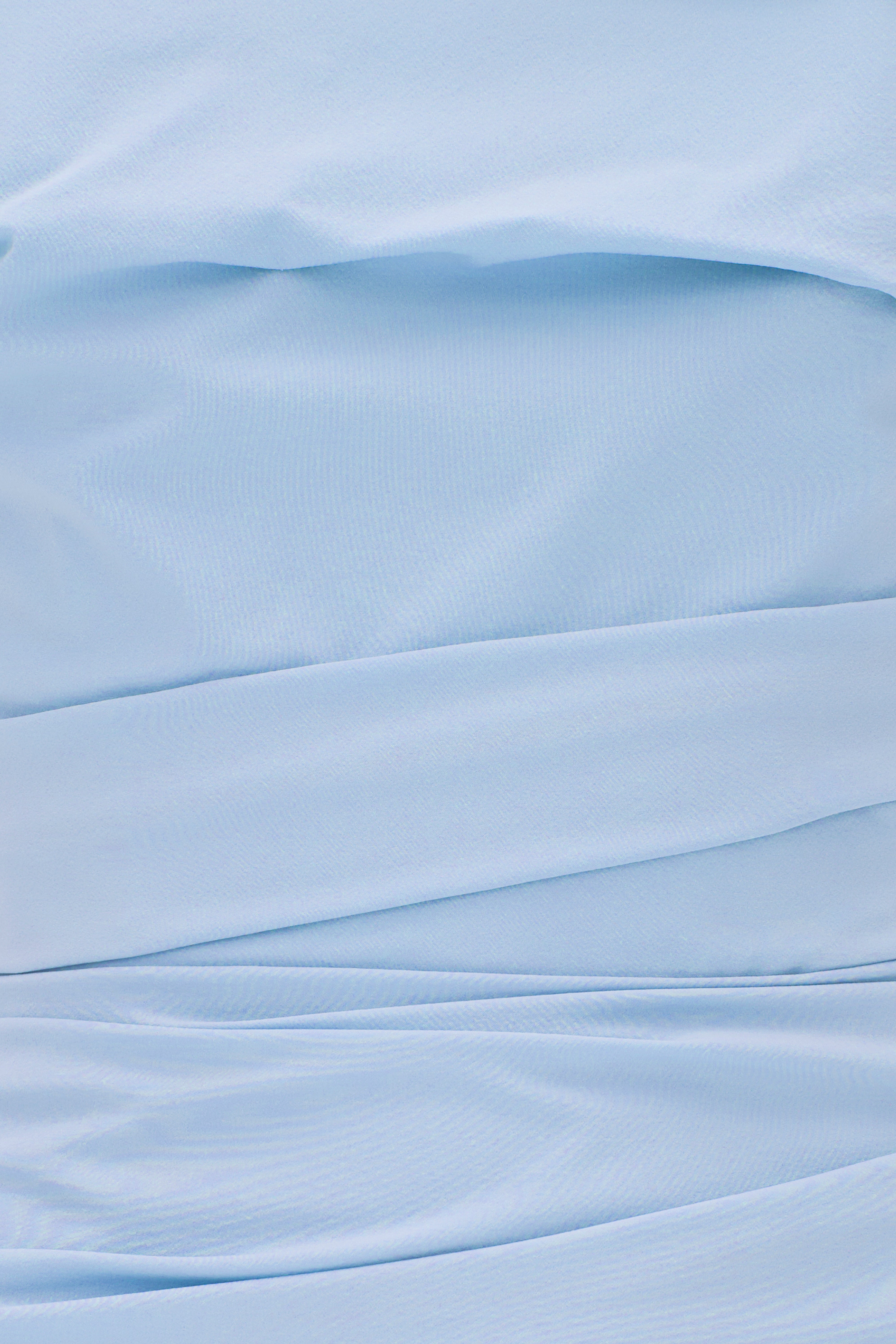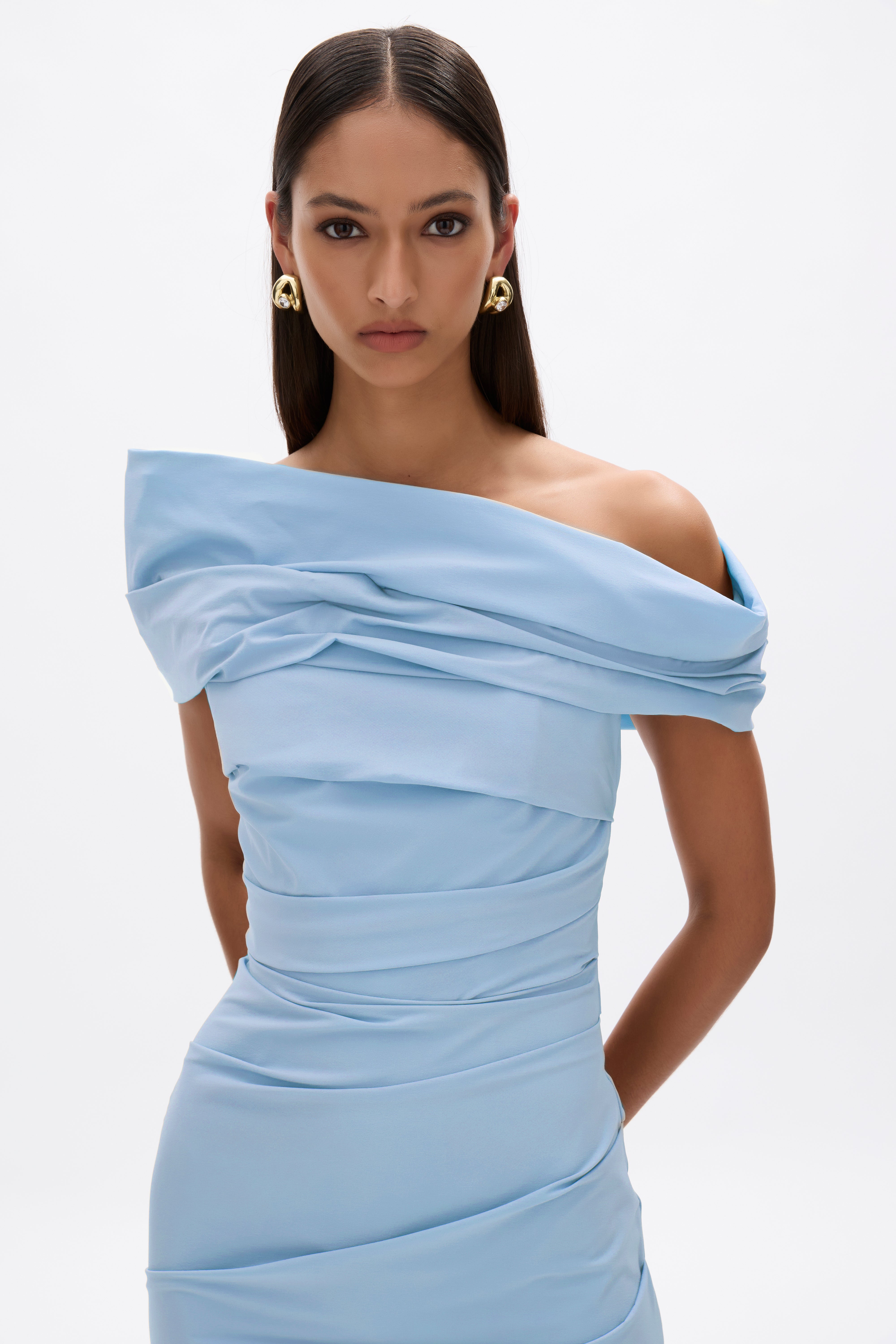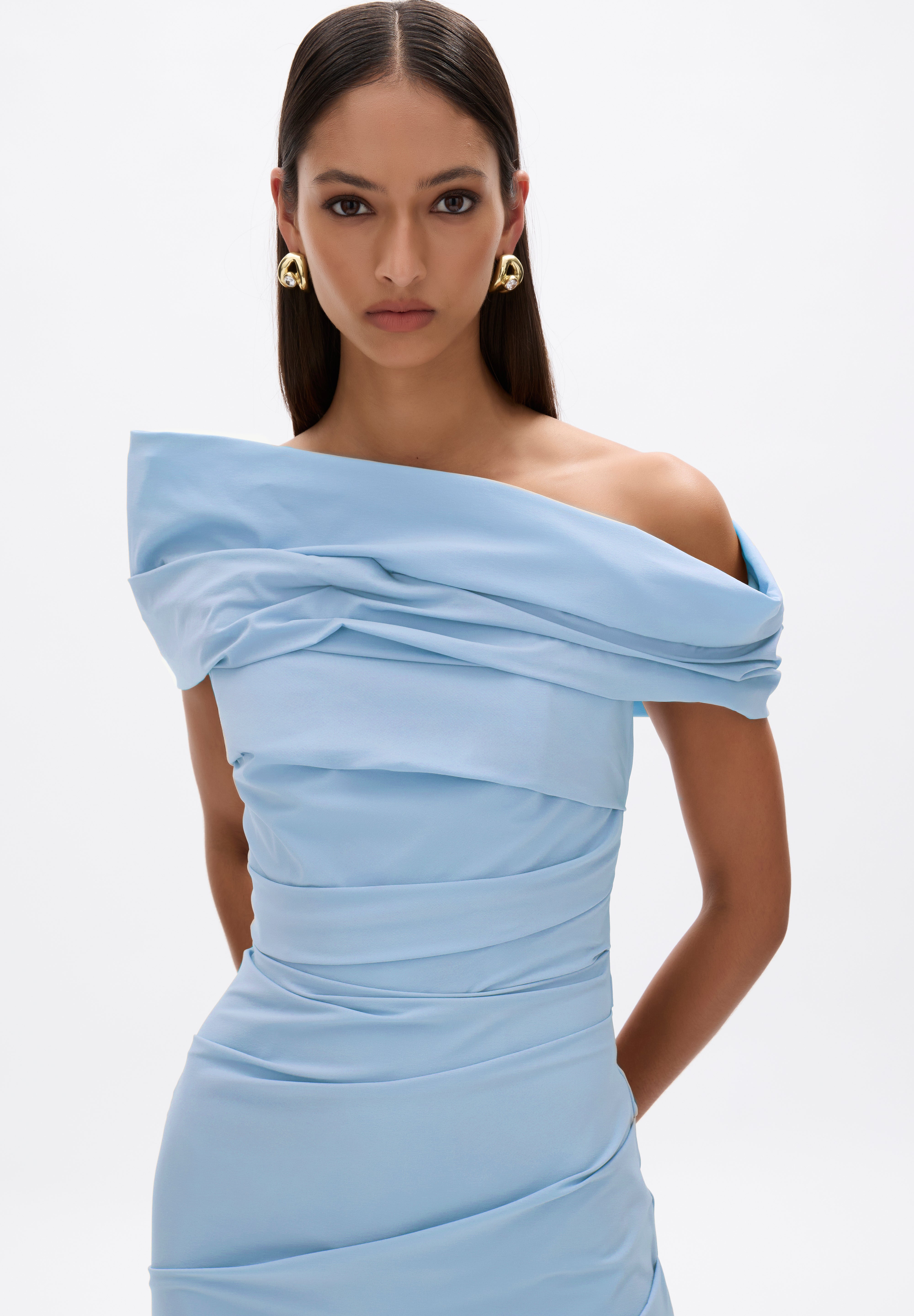 The Monique Gown in Sky Blue is a full length draped column silhouette designed for evening occasions and formal events. It features an asymmetrical neckline with crinoline through the sleeves, finished with soft tucks along the bust and waist for a flattering, sculpted fit.