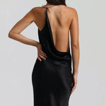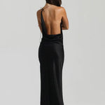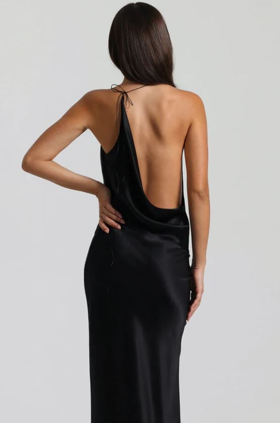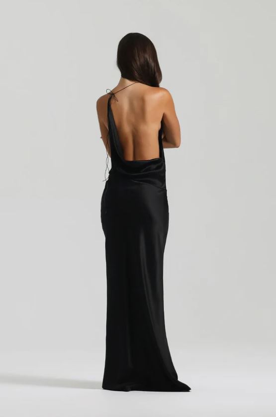 • Design Features: Bias-cut silk silhouette, internal silk bust facing, adjustable cord ties, open back, low-back drape, asymmetric design line