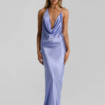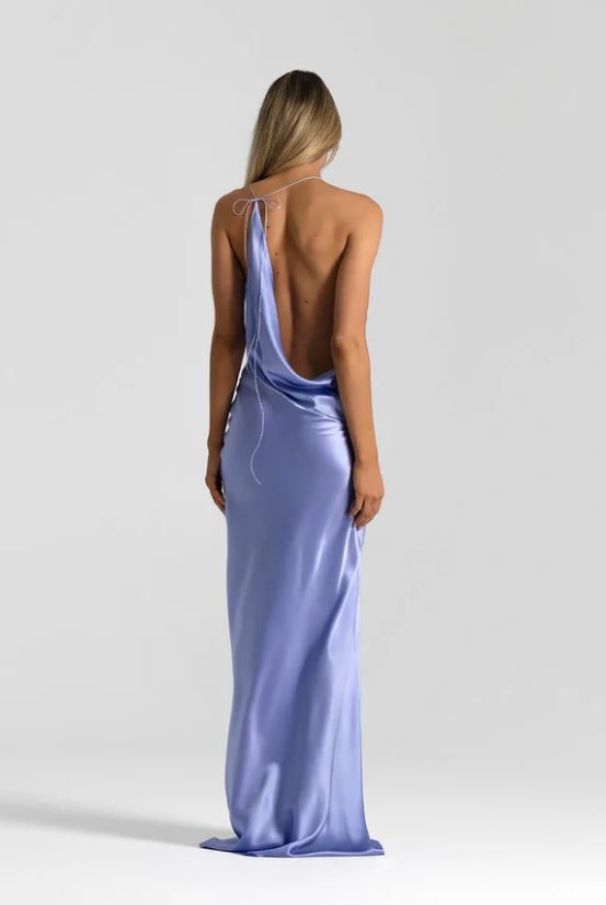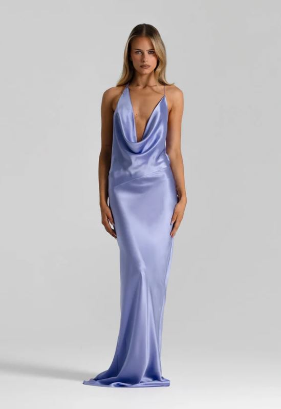 • Design Features: Bias-cut silhouette, internal silk bust facing, adjustable cord ties, draped neckline, open back, asymmetric design line