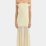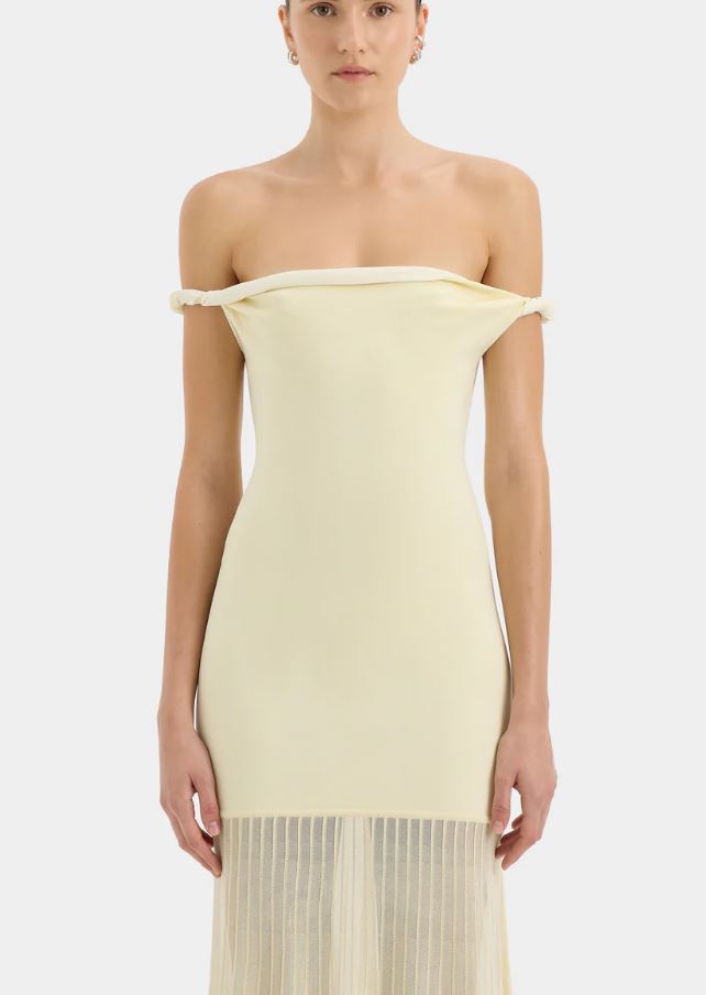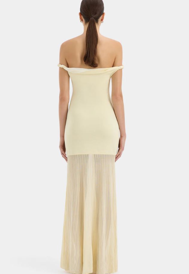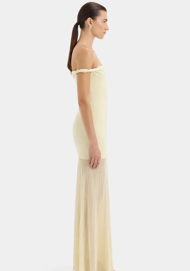The Elia Off Shoulder Twist Dress in Lemon Sorbet is an event silhouette crafted from a compact knit fabrication, designed for a form-fitting and contoured fit. It features an off shoulder neckline with twisted straps, and a pleated full length skirt with a semi-sheer finish.