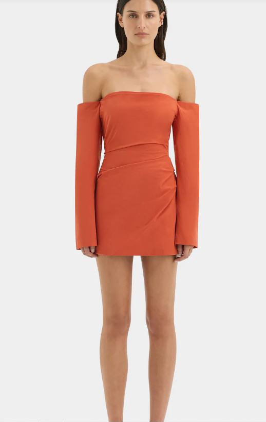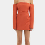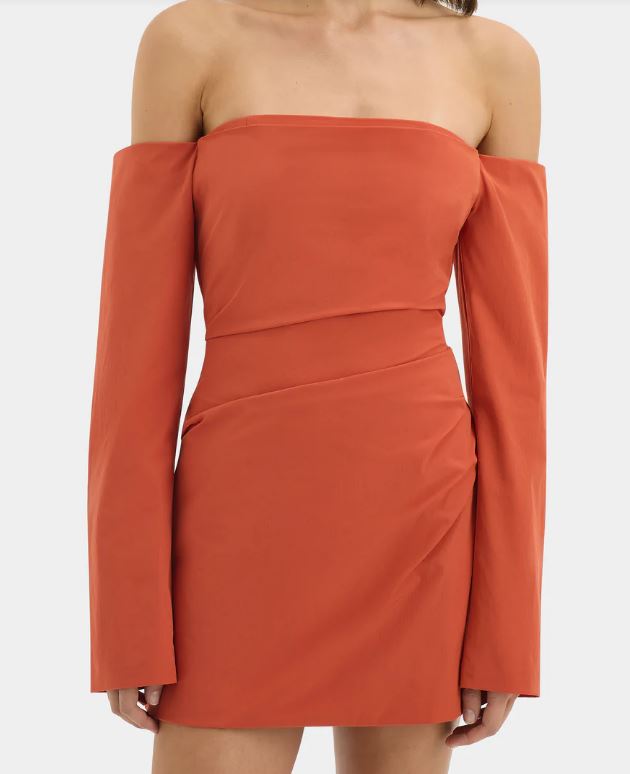 The Rossana Off Shoulder Mini Dress in Terracotta is a feminine silhouette, crafted from form-fitting stretch nylon with a technical handfeel. It features an internal bodice for structure, long off-shoulder sleeves and soft tucks through the body.